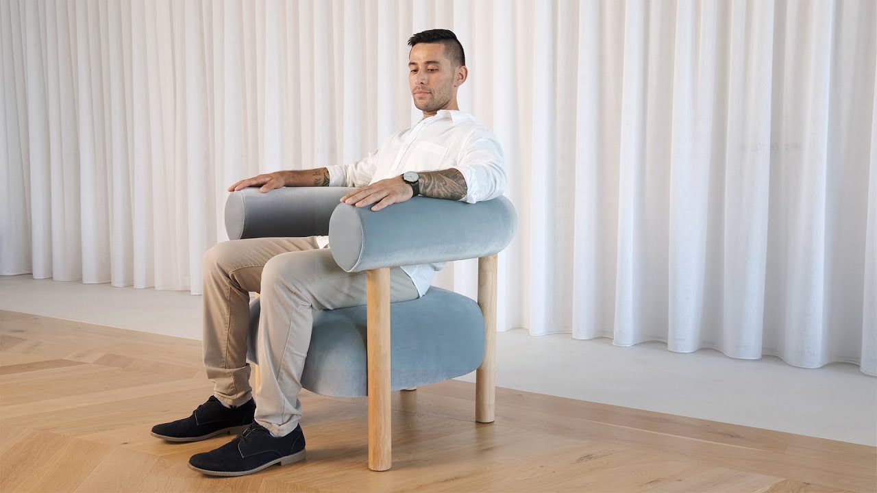 Rocco Chair - Velvet Steel Blue - With a focus on curves and rounded shapes, Rocco hits that sweet spot where retro meets modern. A continuous line from back to arm rests gives it that mid - century mod feel, while natural wood legs create straight lines for that modern touch. Rocco suits most interior design styles from glam to boho, with its smooth Steel Blue velvet tone.